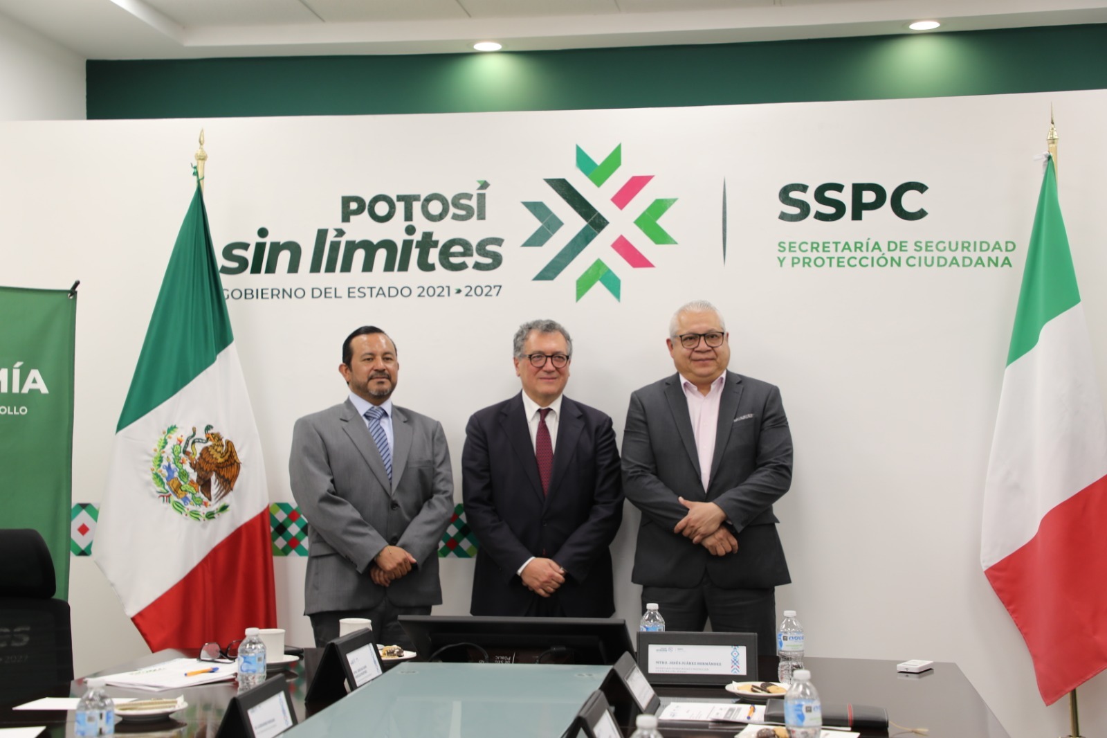 Como parte de la promoción global del Gobernador de San Luis Potosí, Ricardo Gallardo Cardona, para atraer más inversiones sin límites, generar empleos mejor pagados y consolidar el cambio que se vive y se siente en las cuatro regiones, la Secretaría de Seguridad y Protección Ciudadana del Estado (SSPC) y la Secretaría de Desarrollo Económico (Sedeco) recibieron a una comitiva diplomática de Italia encabezada por el embajador Alessandro Modiano.