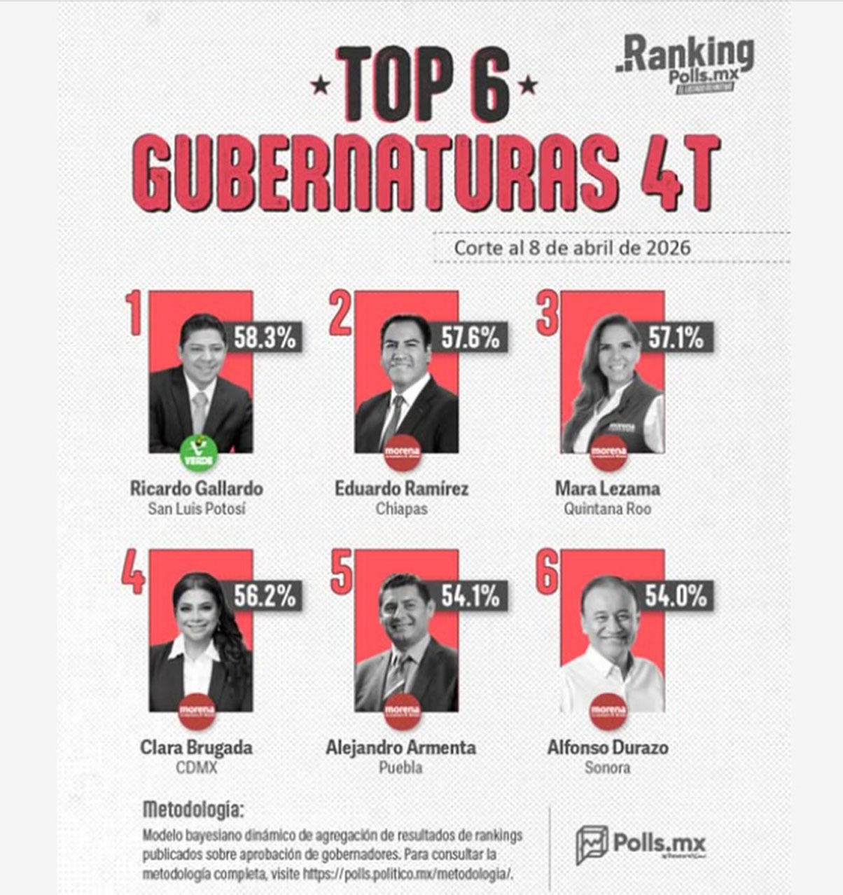 Además, Gallardo Cardona logró escalar posiciones de manera notable en el ranking general de gobernadores, pasando del octavo al quinto lugar de aprobación.