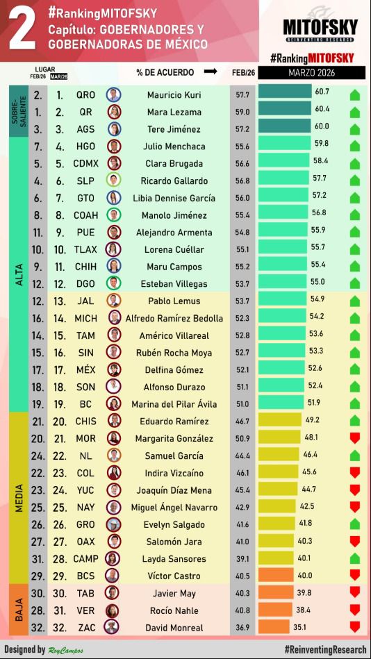 • El mandatario potosino alcanza el sexto lugar nacional en el ranking de aprobación ciudadana de Consulta Mitofsky durante el mes de marzo.