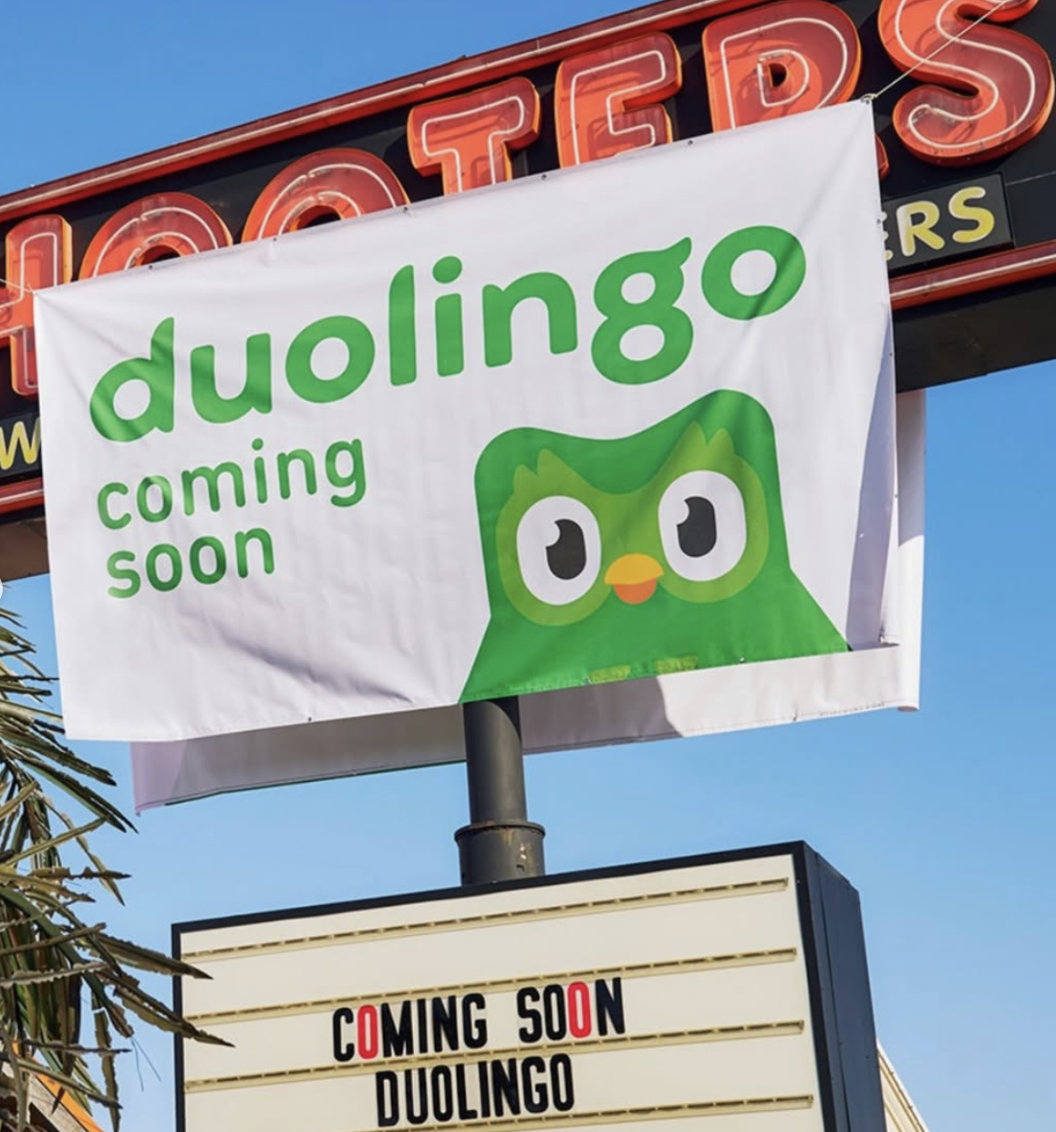 Duolingo llamó la atención al intervenir la fachada de al menos cuatro locales abandonados de Hooters en Estados Unidos con publicidad exterior mínima. En cada punto apareció un cartel con la frase ‘coming soon’ junto a Duo, su icónico búho, sin mayor explicación, lo que despertó curiosidad entre las personas que pasaban y usuarios en redes sociales. 📍🪧