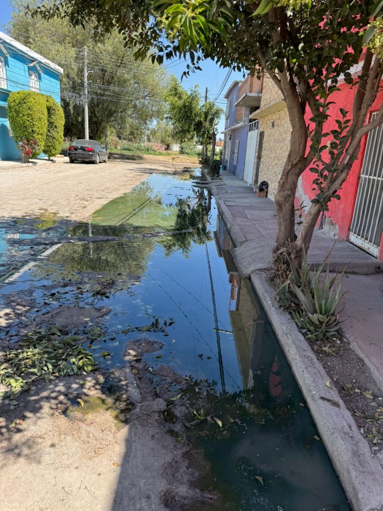 Mediante un recorrido se observó el derrame constante de aguas residuales sobre la vía pública, así como las condiciones de deterioro e insalubridad que esta situación ha generado con el paso del tiempo. Quienes reportan el problema señalaron que las aguas negras no solo está en la calle si no también en sus casas ya que las aguas negras se salen en sus baños.