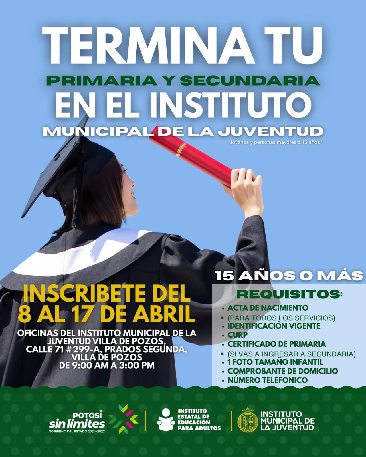 Con el objetivo de impulsar la educación y brindar nuevas oportunidades de desarrollo personal y profesional, el Instituto Municipal de la Juventud de Villa de Pozos lanzó la convocatoria para que jóvenes y personas mayores de 15 años puedan concluir sus estudios de primaria y secundaria.