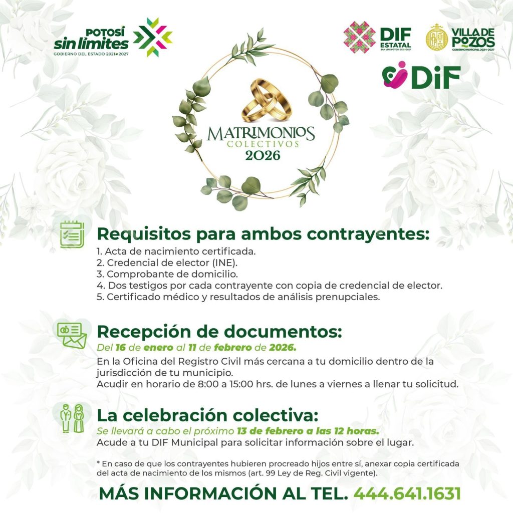 El Gobierno Municipal de Villa de Pozos, a través del Sistema Municipal DIF, invita a las parejas que desean formalizar su unión a aprovechar los últimos días para entregar su documentación y participar en la campaña de Matrimonios Colectivos, una iniciativa que busca brindar certeza jurídica a las familias, fortalecer los lazos comunitarios y facilitar el acceso a este trámite de manera ordenada y accesible para la población.